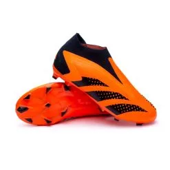 Bota de fútbol Predator Accuracy+ FG para niños. Botas sintéticas sin cordones para utilizar en campos de césped natural. Botas de gama alta en color Solar Orange-Core Black.