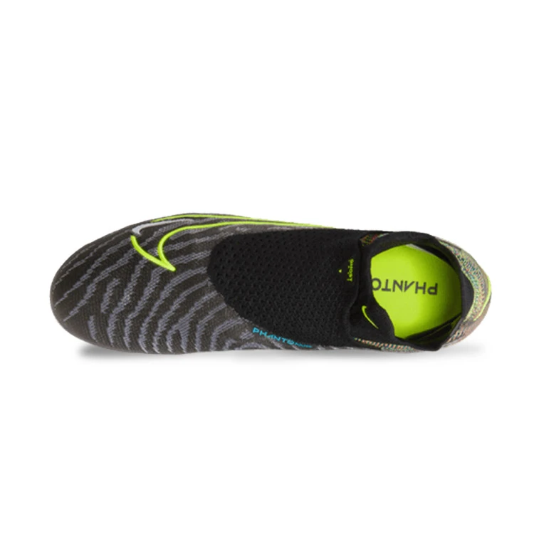 Bota de fútbol Nike Phantom GX Elite DF FG para adultos. Bota de hilo con calcetín, para utilizar en campos de hierba natural seca o húmeda. Botas de gama alta para jugadores de control y precisión en color Black-Volt-White-Blue Glow-Pink Blast