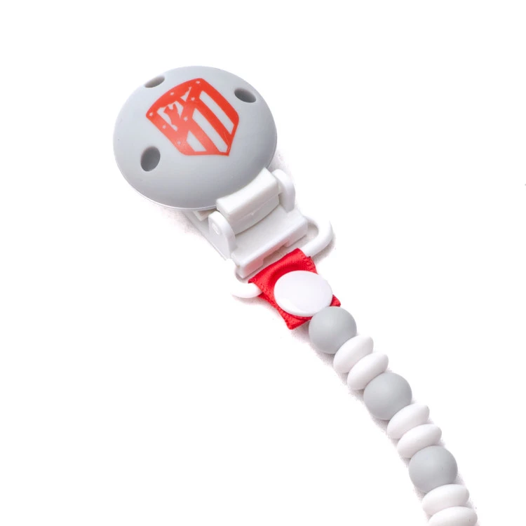 Cadena porta-chupetes Atlético de Madrid, para llevar el chupete siempre seguro. Escudo del equipo en el frontal de la pinza para compartir con tu bebe la afición por el Atlético y sus colores.