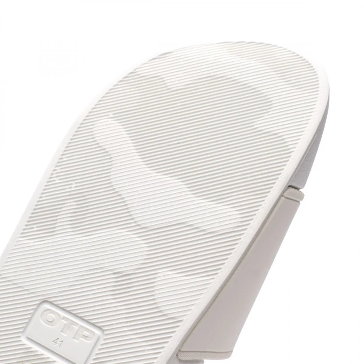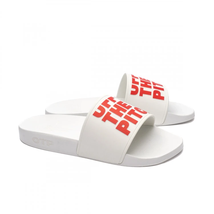 Chanclas Off The Pitch en blanco. Un imprescindible para los cálidos días de verano. Estilo pala con el logotipo de la marca OTP en rojo.
