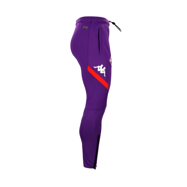Pantalón de entrenamiento del equipo de la ciudad italiana Florencia para la temporada 2022-2023 para hombre en tejido interlock pesado elástico y con tecnología HYDRO-WAY PROTECTION. AJUSTADO. Cintura elástica con cordón interior, bolsillos con cremallera, inserciones en los costados y en la pantorrilla con tejido de compresión. Logo Omini en los laterales aplicado con termotransferencia y parche con el logo del Team. ACF FIORENTINA.