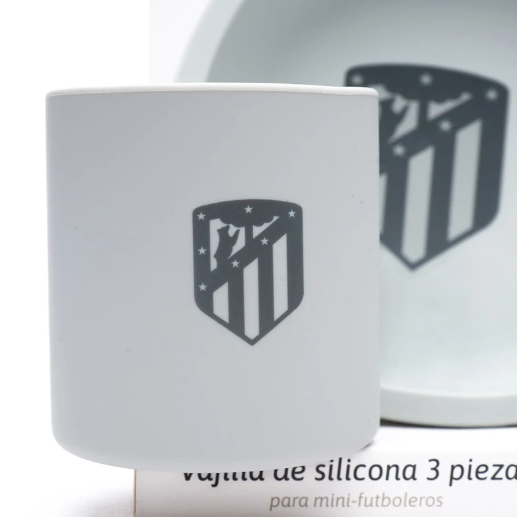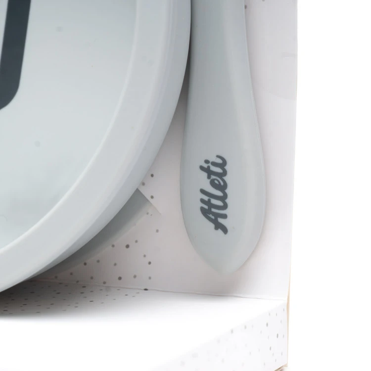 Set de alimentación bebé Atlético de Madrid. Cuenta con una plato con el escudo del equipo, una taza y la cuchara a conjunto. Fabricado en silicona.